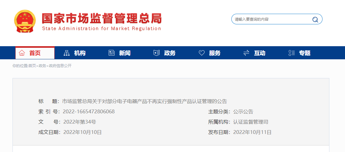 On October 11, 2022, the State Administration of Market Supervision and Administration announced that some electronic and electrical products will no longer be subject to compulsory product certification management.