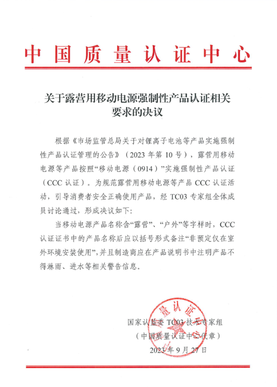 近日,國家認監委官網發布關于露營用移動電源強制性產品認證相關要求、鋰離子電池強制性產品認證單元劃分和測量允差的兩項決議。