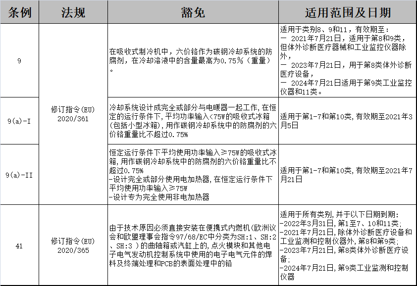 2020年3月5日,歐盟官方日志(Official Journal of the European Union)上發布了五項新指令,其中關于2011/65/EU的(表格一)修訂條款包括9,9(a)-I,9(a)-II,41;(表格二)的修訂條款為37,41,新增豁免條款44。