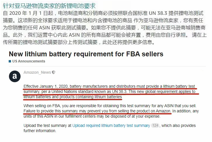 近日,各亞馬遜電商陸續收到了官方通知,要求自2020年1月1日起,電池制造商和經銷商必須根據聯合國標準UN38.3提供鋰電池測試摘要,這一新的全球要求適用于所有的鋰電池和含鋰電池的產品。 該規定雖然是亞馬遜對FBA配送的賣家發出的通知,但根據該規定,所有出售鋰電池及包含鋰電池產品的賣家都必須按照UN38.3標準,提供相應的檢測摘要,并不僅僅只是使用亞馬遜FBA配送的賣家,也不僅僅只是亞馬遜賣家,而是全球出售鋰電池及包含鋰電池產品的所有賣家!