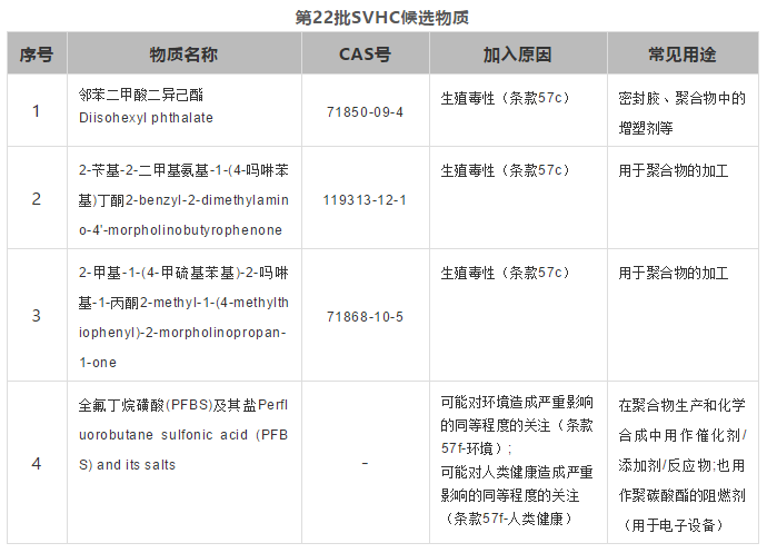 歐洲化學品管理局(ECHA)于2020年1月16日公布了新一批高關注物質,之前咨詢清單上的4項物質全部加入了候選清單。 其中鄰苯二甲酸二異己酯、2-芐基-2-二甲基氨基-1-(4-嗎啉苯基)丁酮、2-甲基-1-(4-甲硫基苯基)-2-嗎啉基-1-丙酮由于生殖毒性,而全氟丁烷磺酸(PFBS)及其鹽由于其多種特性,被加入到SVHC候選物質清單中。至此SVHC候選物質清單共包括22批205種物質。 中認聯科提醒企業在生產或進口這些物質以及含有這些物質的產品時需要根據候選清單明確它的潛在義務。
